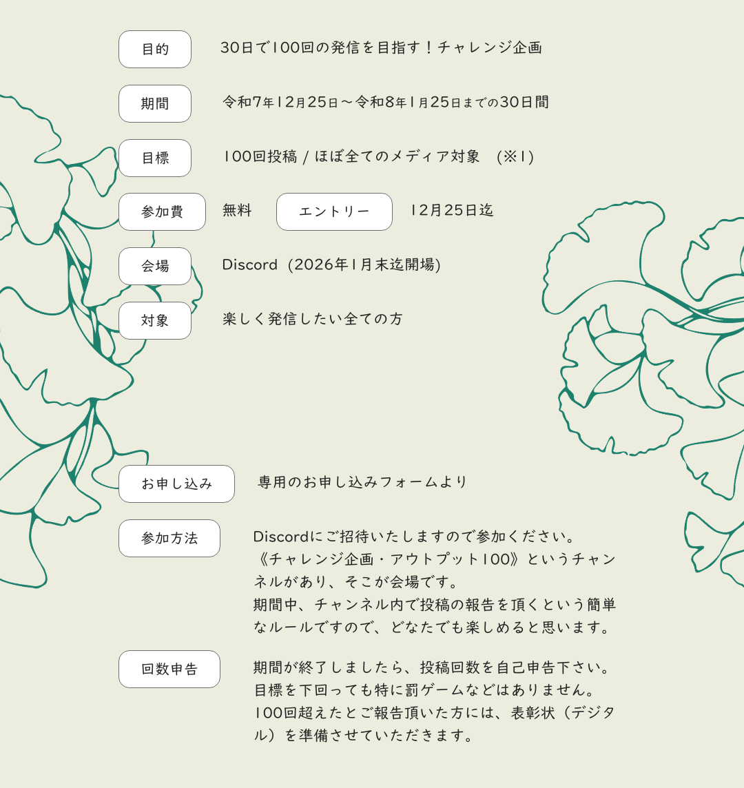 | 《参加方法》 | Discordにご招待いたしますので参加ください。 《チャレンジ企画・アウトプット100》というチャンネルがあり、そこが会場です。 期間中、チャンネル内で投稿の報告を頂くという簡単なルールですので、どなたでも楽しめると思います。 |