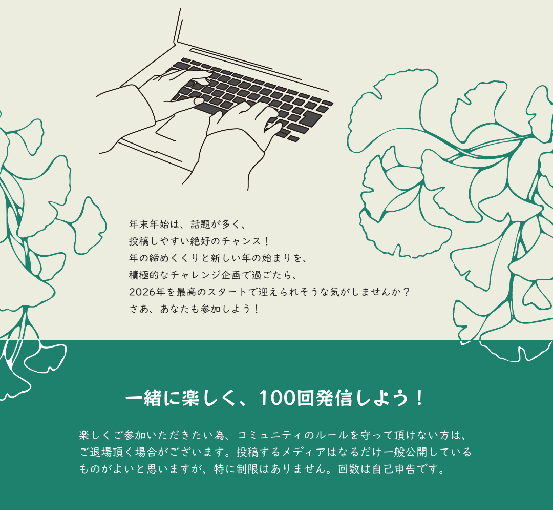 30日の間に、Instagram / BLOG / YouTube / ポッドキャストやその他メディア媒体に、100回投稿するのを、一緒に挑戦しよう!というチャレンジ企画です。